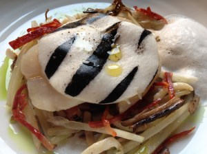 Poached monkfish with shellfish and striped with squid and squid ink with a braised fennel bulb and a dill and red wine sauce.