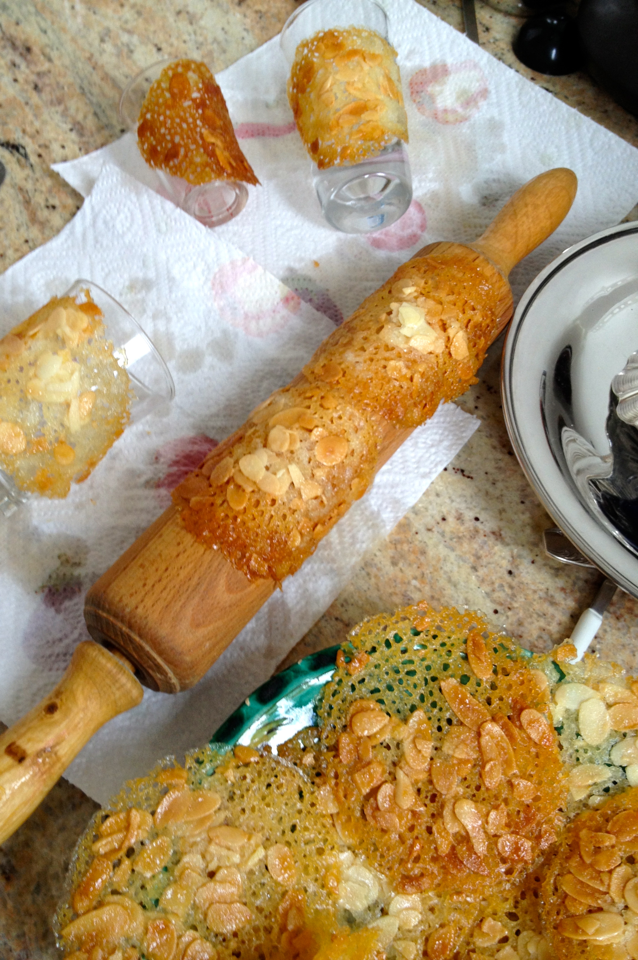 • Carefully peel off the tuiles and cool them for a few minutes on paper towels or shape them on a narrow glass or rolling pin until hardened.